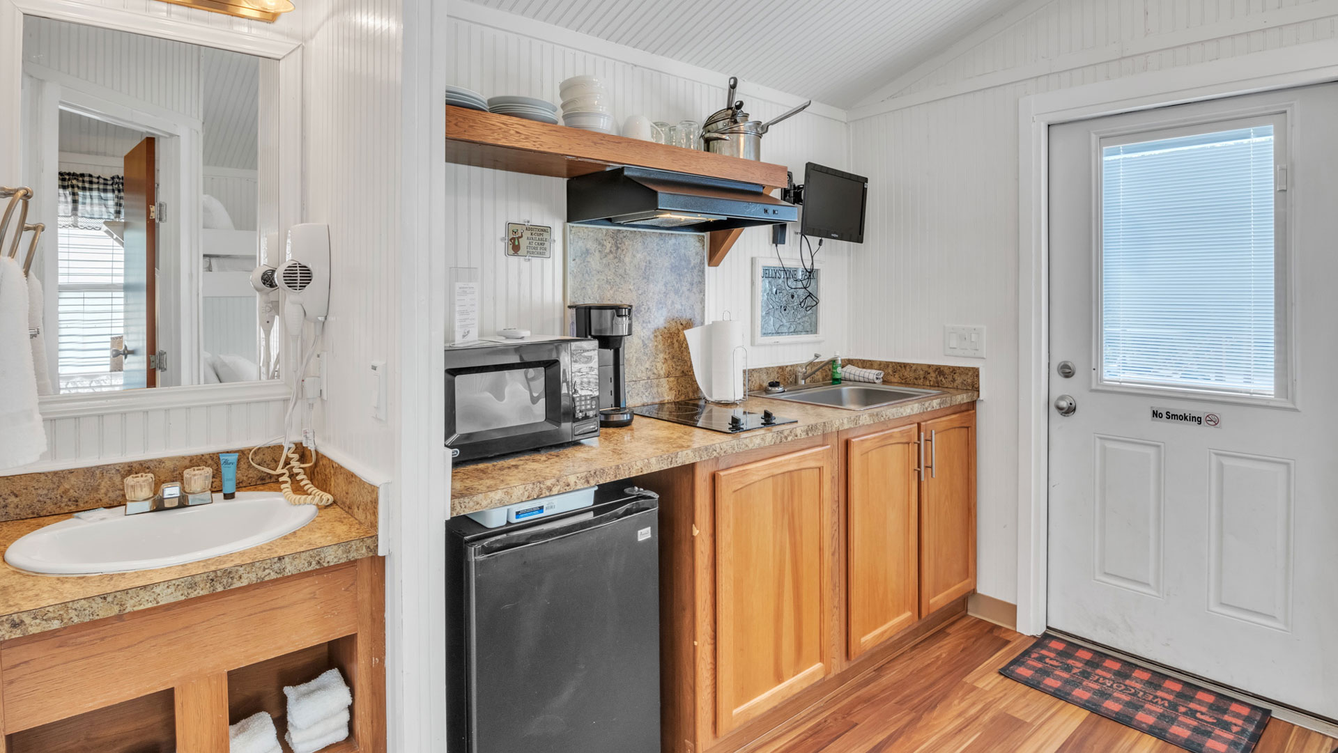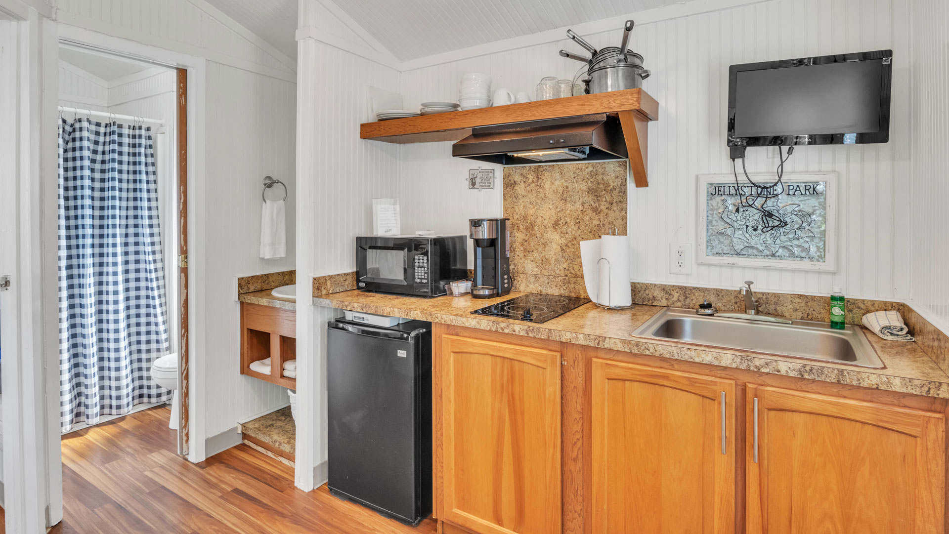 Bear Essentials Cabins have an outside grill, picnic table, wood burning fire pit, electricity, heat and air conditioning, full bath with shower, flat screen TV with cable, microwave, and a coffee pot. These cabins have three(3) rooms, the common room that includes the kitchenette and one(1) set of bunk beds(twin on top and a full bed on the bottom), the bathroom, and a bedroom with a double bed. Price includes parking for one vehicle, additional vehicles will be $10 per day, Car/utility trailers $30 per day.