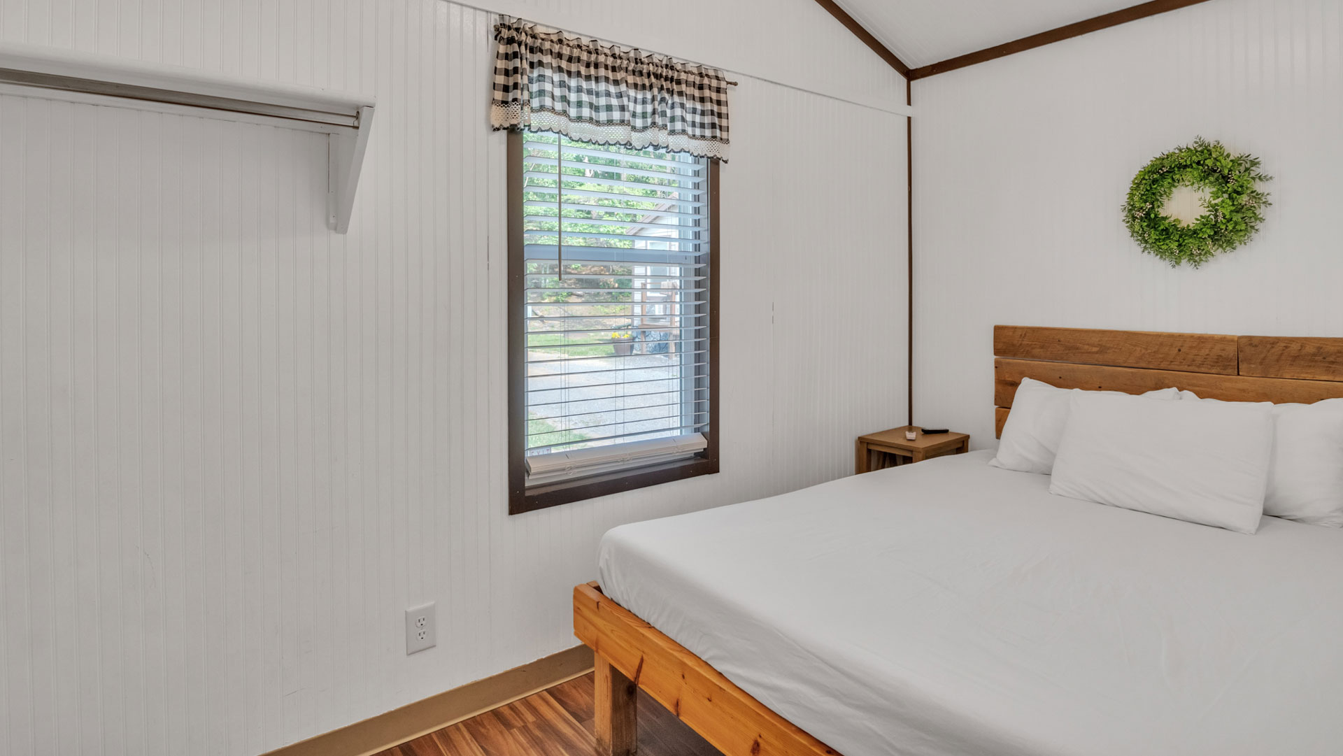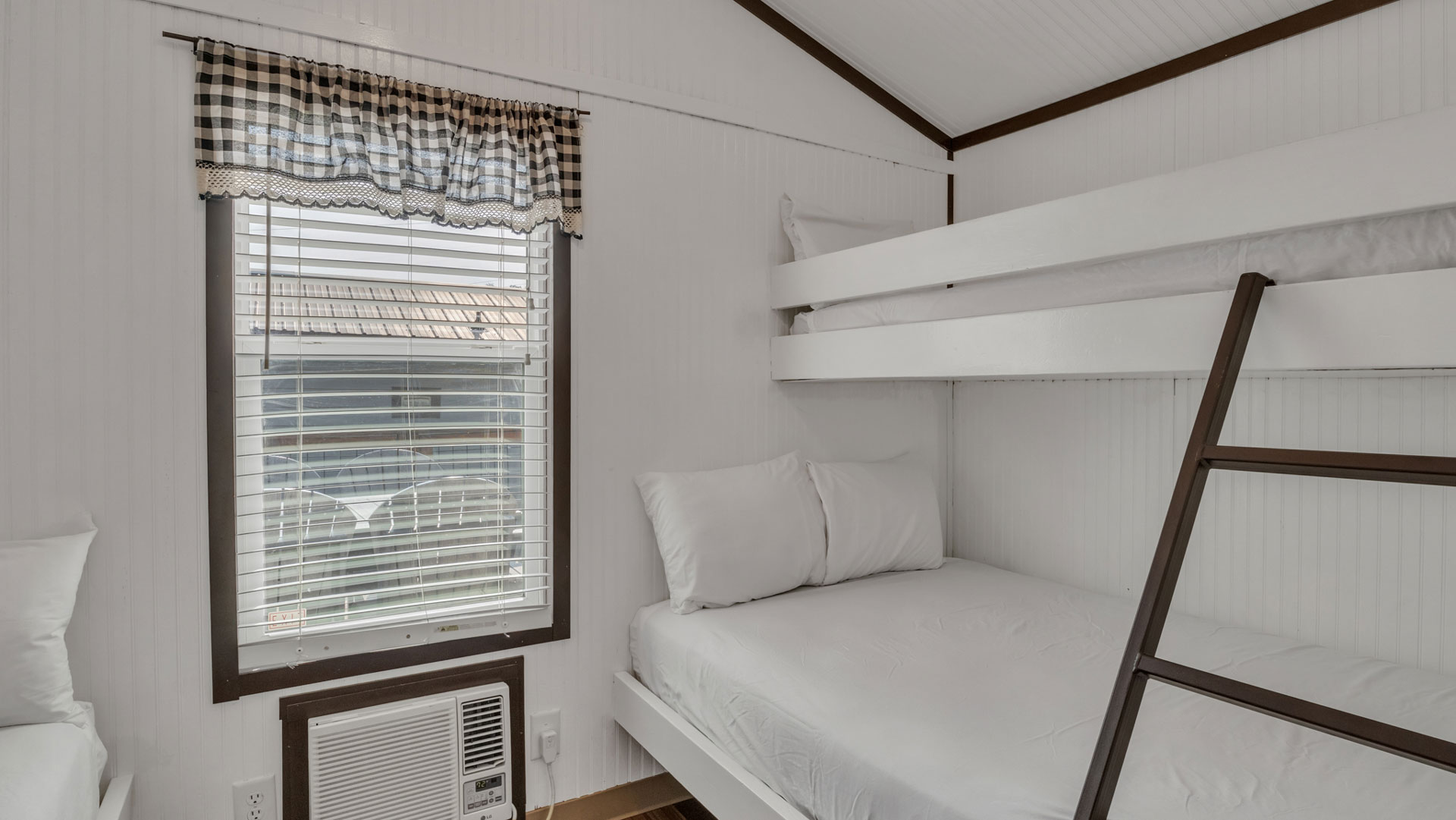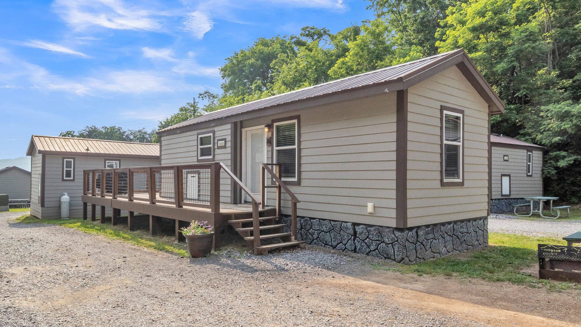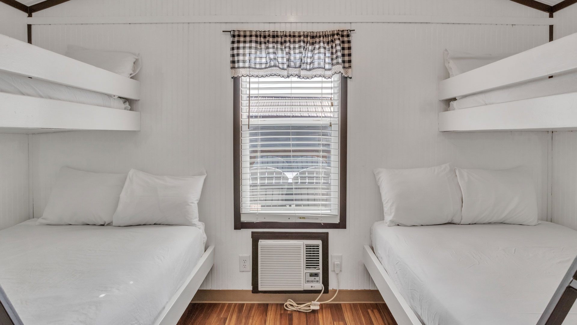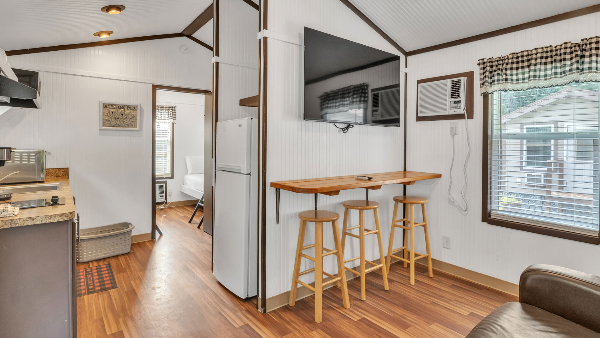 Black Bear's Den cabins have an outside grill, picnic table, wood burning fire pit, electricity, heat and air conditioning, full bath with shower, flat screen TV with cable, full kitchen, microwave, and a coffee pot. These cabins have four(4) rooms, the common room that includes the kitchen, a bedroom that includes two sets of bunk beds, the bathroom, and a bedroom with a queen bed. Both bunk beds have full mattress on the bottom and twin on top. Price includes parking for two vehicles, additional vehicles will be $10 per day, car/utility trailers will be $30.00 per day. Linens are included.