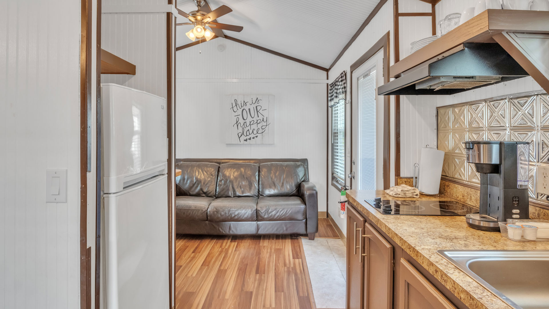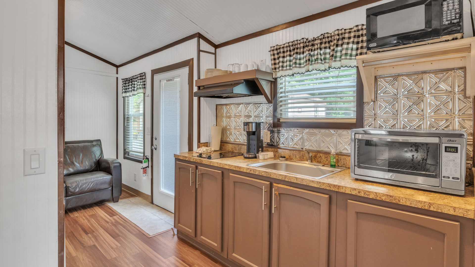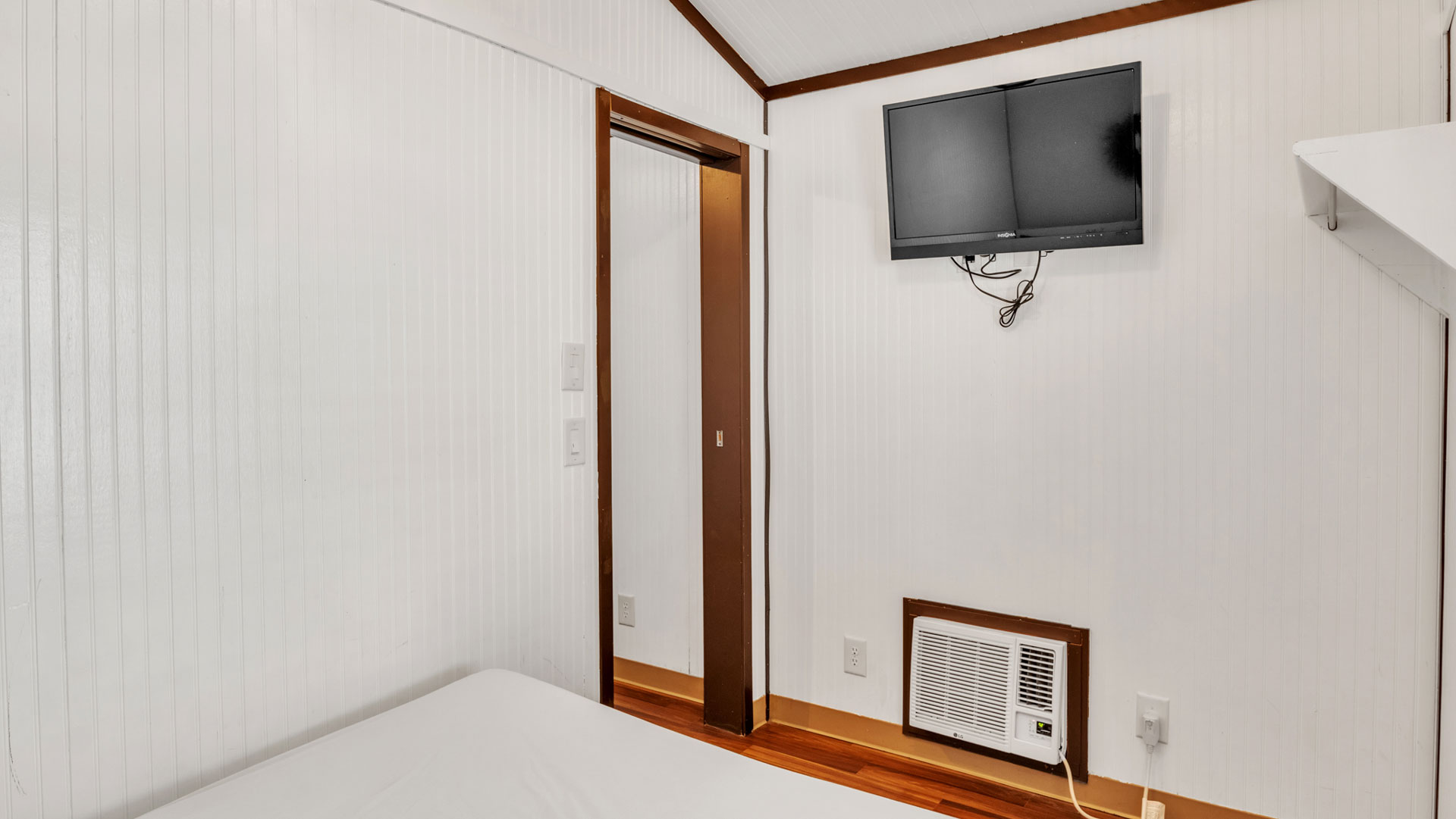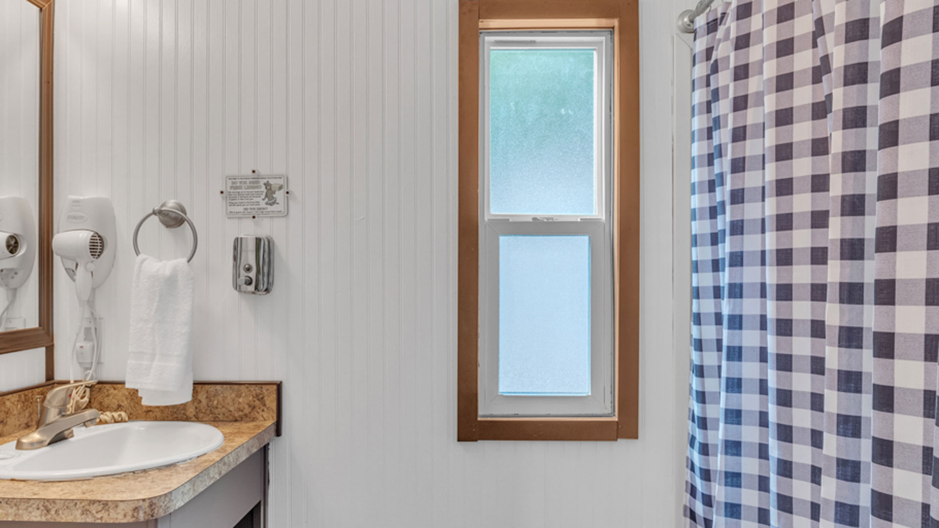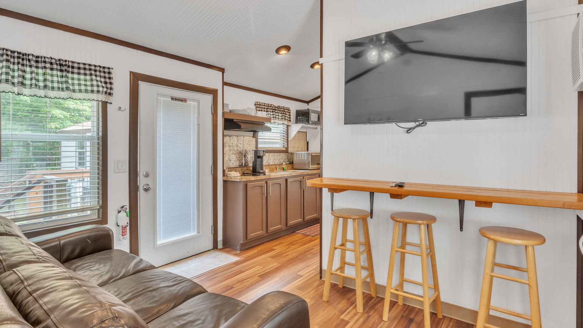 Black Bear's Den cabins have an outside grill, picnic table, wood burning fire pit, electricity, heat and air conditioning, full bath with shower, flat screen TV with cable, full kitchen, microwave, and a coffee pot. These cabins have four(4) rooms, the common room that includes the kitchen, a bedroom that includes two sets of bunk beds, the bathroom, and a bedroom with a queen bed. Both bunk beds have full mattress on the bottom and twin on top. Price includes parking for two vehicles, additional vehicles will be $10 per day, car/utility trailers will be $30.00 per day. Linens are included.