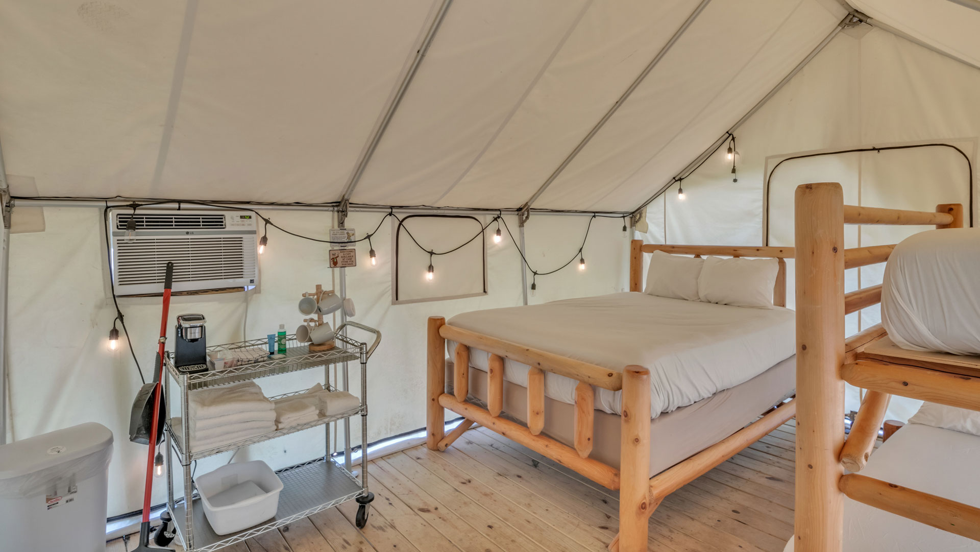 The tents for 5 guests feature a queen-size bed and a bunk bed with full on bottom and twin on top. All beds are outfitted with crisp cotton sheets to ensure guests lull off into a restful slumber after enjoying the local festivities.