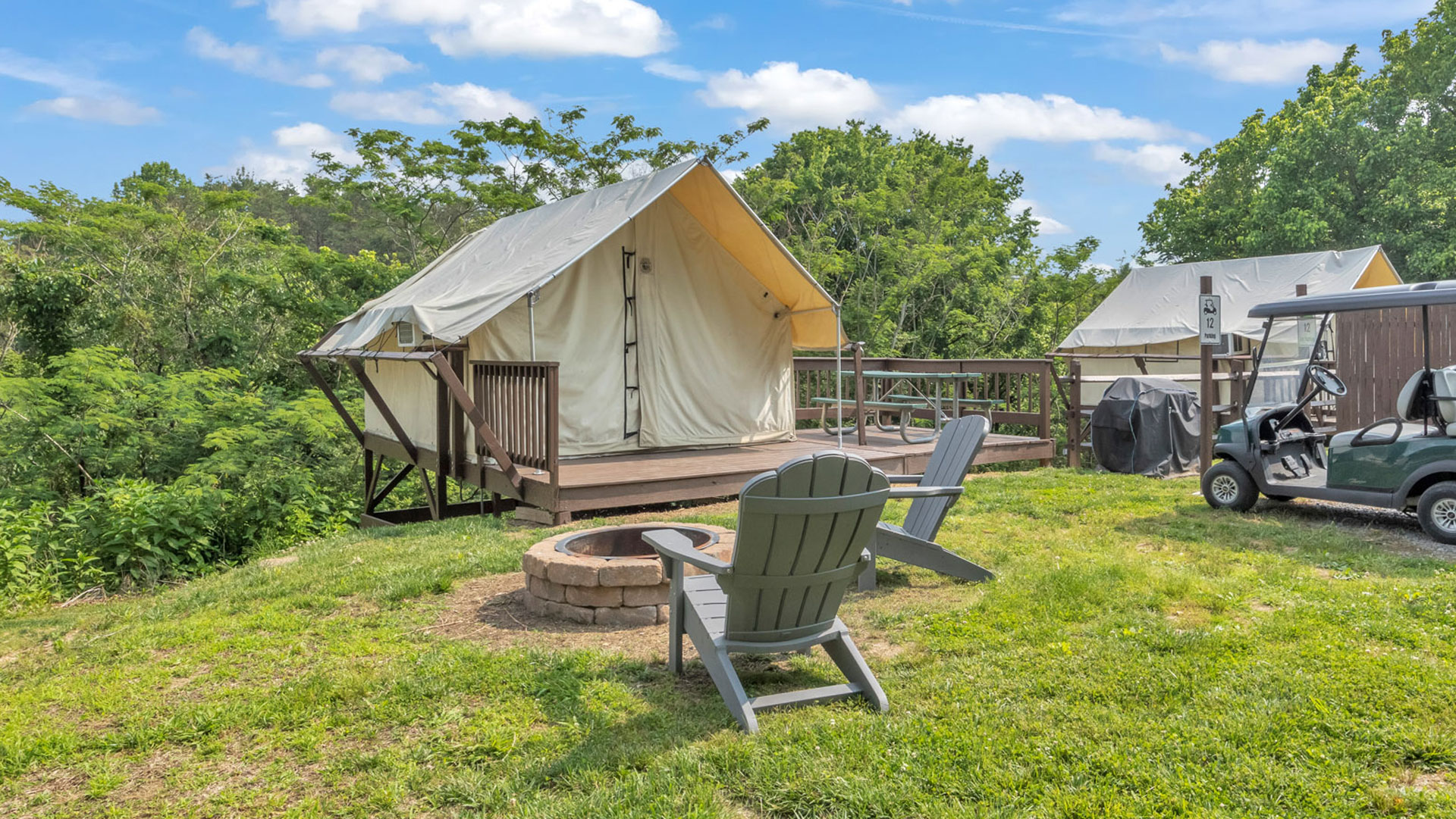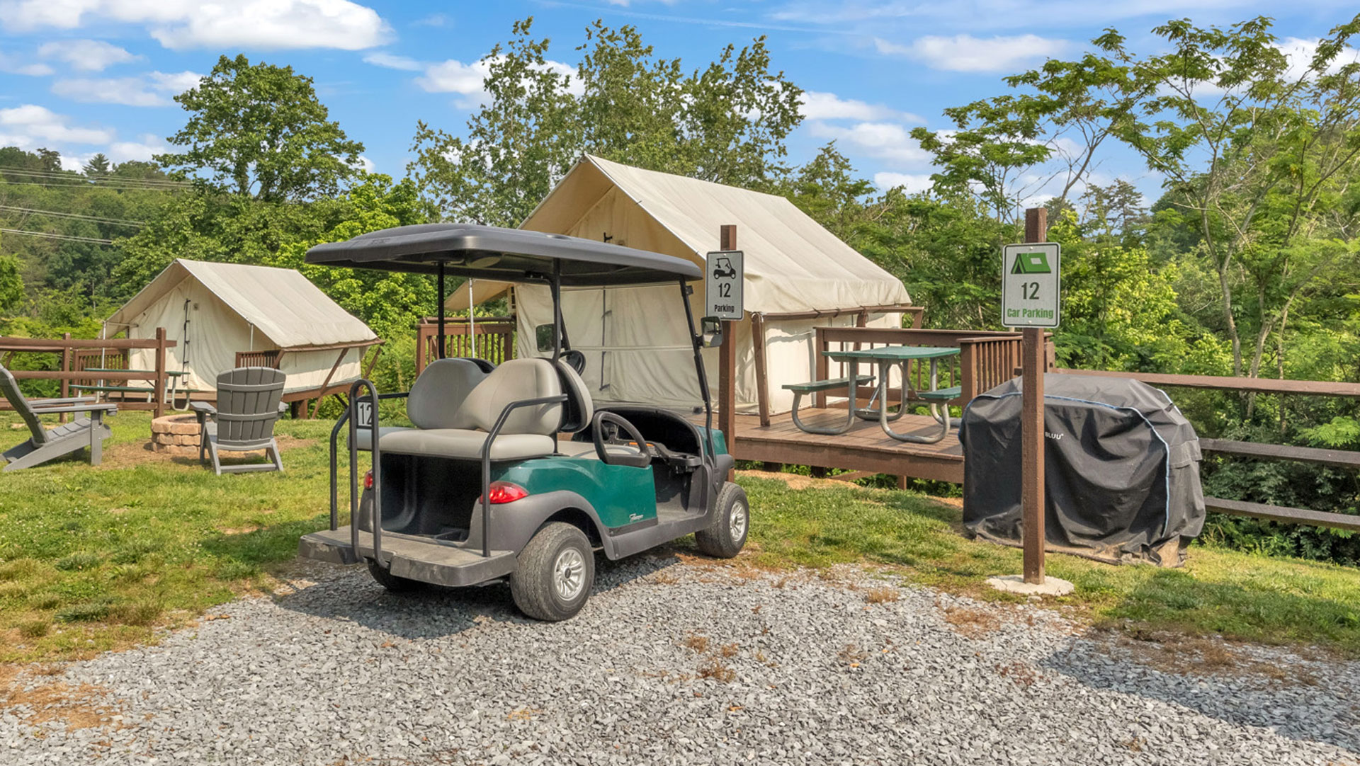 While these tents do not have a private bathroom, the communal showers and restrooms are just a short walk away. They are private individual rooms with very nice titled shower. Other amenities include heating, air conditioning, and a coffee pot. Outside, there is a small porch with seating where glampers can sip on simmering coffee in the early morning, admire a gorgeous sunset, or marvel at the twinkling stars in the midnight sky. The fire pit, picnic table, and gas grill make for an enjoyable outdoor space. The price includes an individual golf cart for you to drive all around the property.