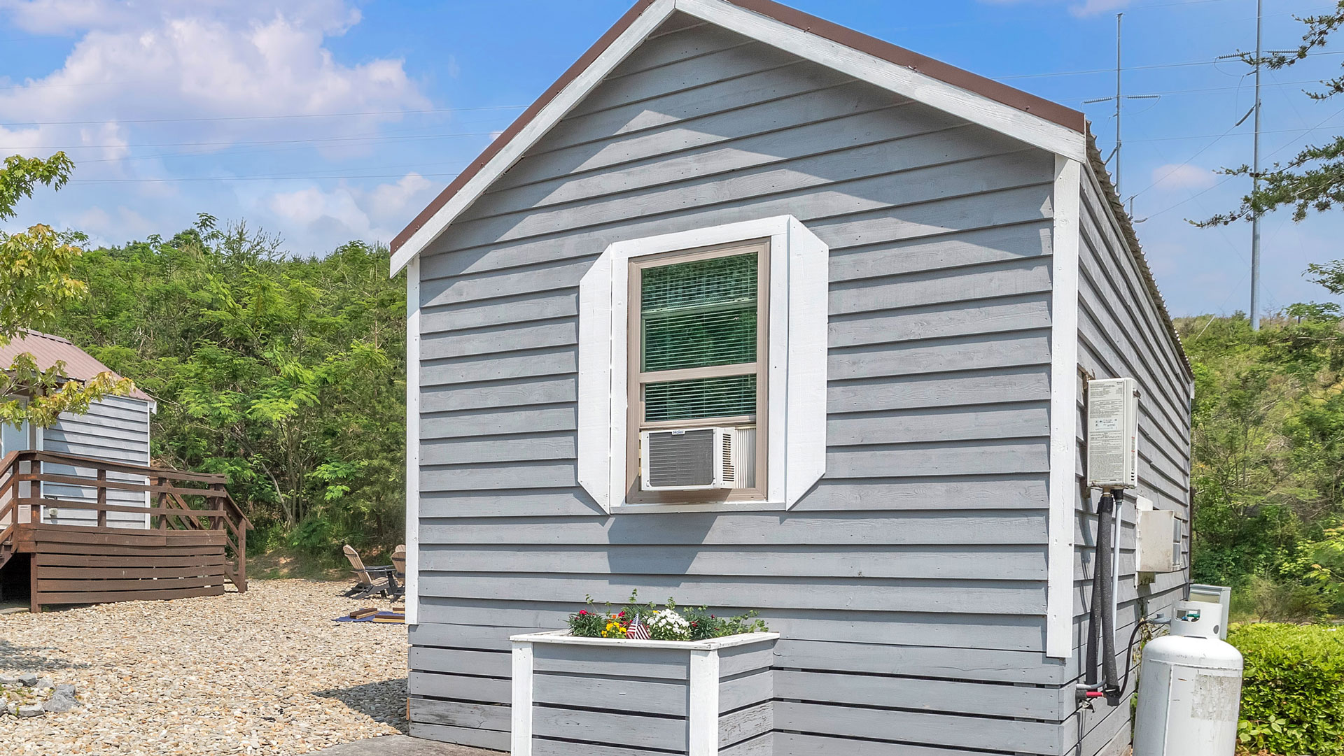 A small studio layout camping cabin located directly in front of our fishing pond. Includes small kitchenette and a full bathroom.
