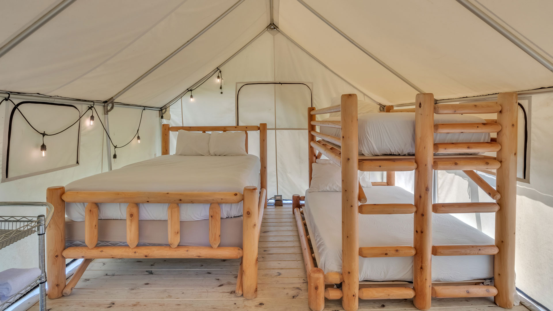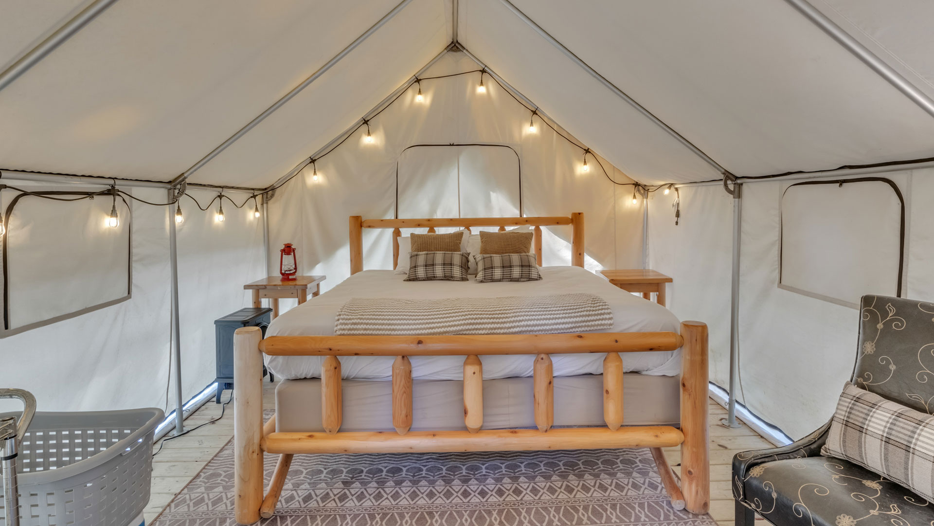 Glamping tent featuring a king size bed. Basic electric and air conditioning!