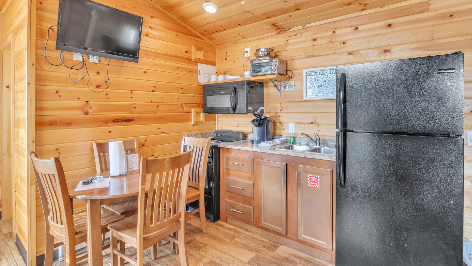 Guests also have access to all communal areas, including a small fishing pond, a swimming pool (seasonal), a pizza shop, a gift shop, and a playground.