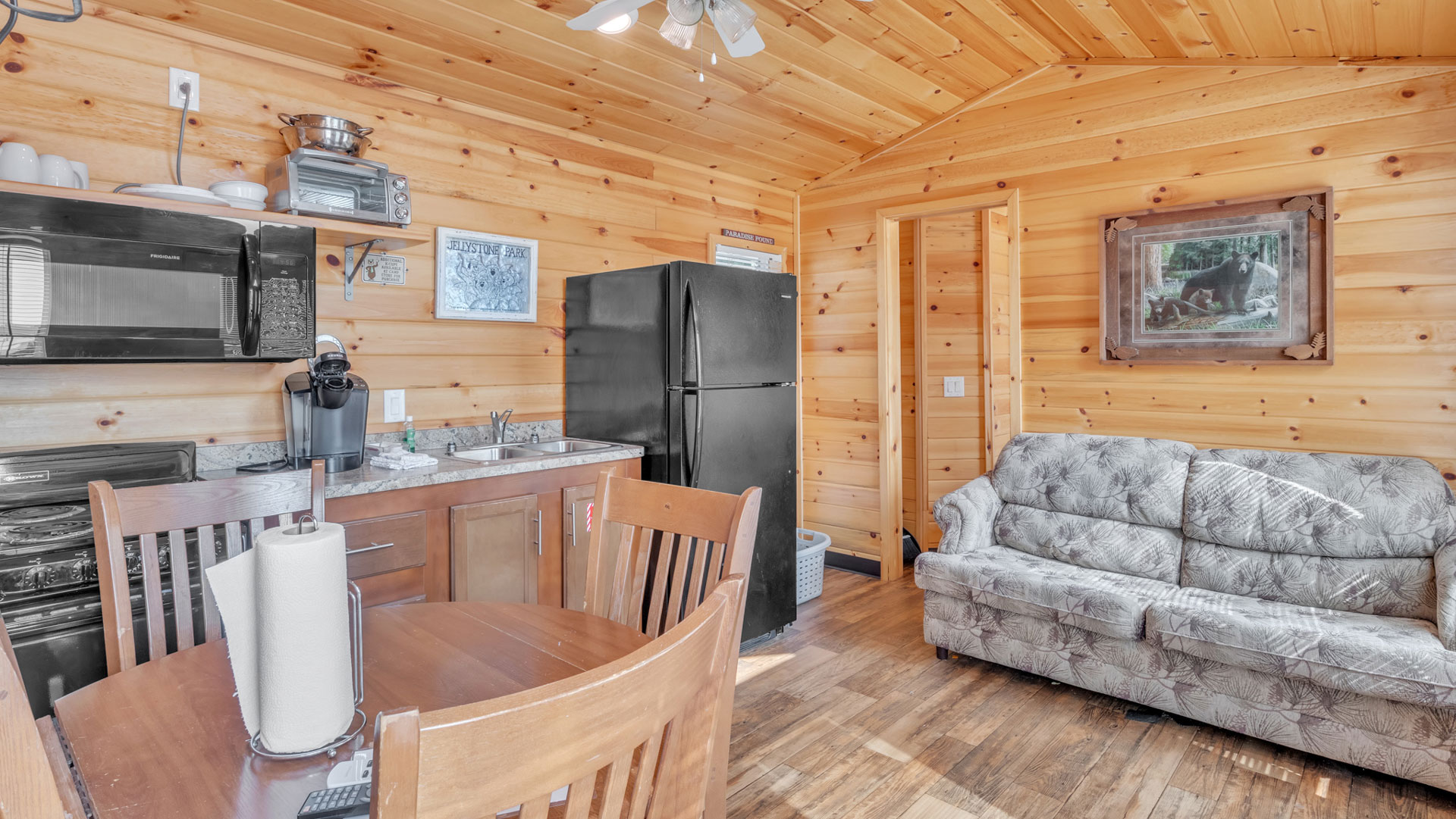 The Mama Bear's Den has 2 queen beds, pull out hide-a-bed, 1.5 bathrooms, heat/air, refrigerator, microwave, cooktop, coffee pot, and 3 TVs with cable. Price includes parking for two vehicles, additional vehicles will be $10 per day. car/utility trailers will be $30.00 per day. Linens are included.